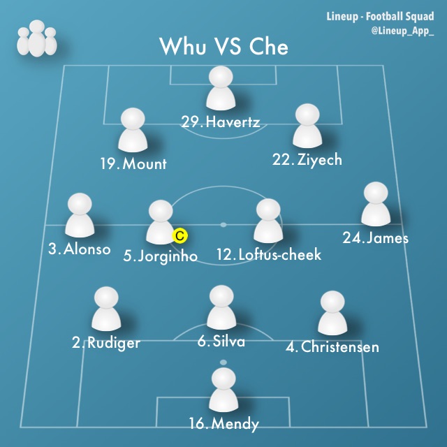 チェルシーのスターティングメンバーは、メンディ、クリステンセン、チアゴ・シウバ、リュディガー、ジェームズ、ジョルジーニョ(c)、ロフタスチーク、アロンソ(プリシッチ、後半28分〜)、ツィエク(オドイ、後半20分〜)、ハヴァーツ(ルカク、後半開始〜)、マウントで、フォーメーションは3-4-3。なおコバチッチ、カンテ、チルウェル、チャロバーは怪我のため欠場となった。