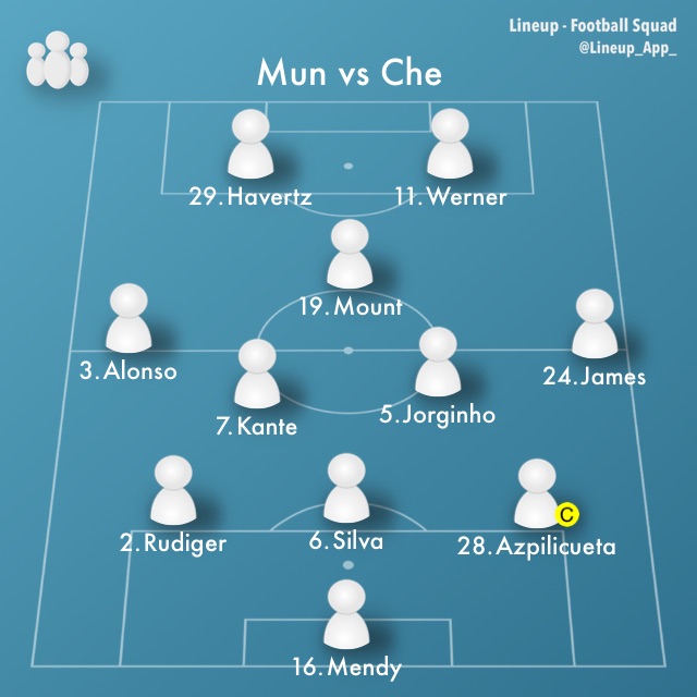 スターティングメンバーは、メンディ、アスピリクエタ、リュディガー、シウバ、アロンソ、カンテ(ロフタスチーク、後半37分~)、ジョルジーニョ、ジェームズ、マウント、ヴェルナー(プリシッチ、後半26分~)、ハヴァーツ(ルカク、後半25分~)でフォーメーションは3-4-1-2。なお、チルウェル、オドイ、コバチッチ、クリステンセン、バークリーは怪我や病気のため欠場となった。