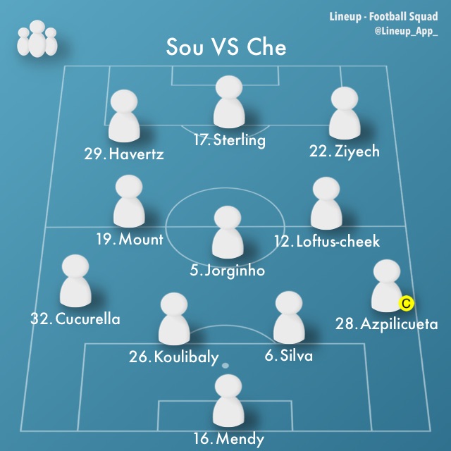 スターティングメンバーは、メンディ、アスピリクエタ、シウバ、クリバリ、ククレジャ、ロフタスチーク、ジョルジーニョ、マウント、ツィエク、ハヴァーツ、スターリングでフォーメーションは4-3-3。
