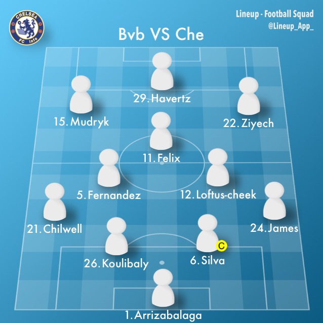 スターティングメンバーは、ケパ、ジェームズ、シウバ、クリバリ、チルウェル、フェルナンデス、ロフタスチーク、ツィエク、フェリックス、ムドリク、ハヴァーツでフォーメーションは4-2-3-1。