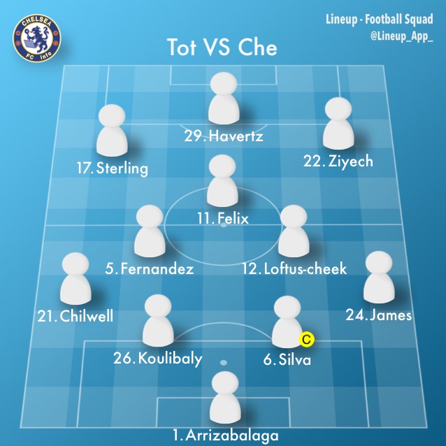 スターティングメンバーは、ケパ、ジェームズ、クリバリ、シウバ、チルウェル、フェルナンデス、ロフタスチーク、ツィエク、フェリックス、スターリング、ハヴァーツでフォーメーションは、4-2-3-1。