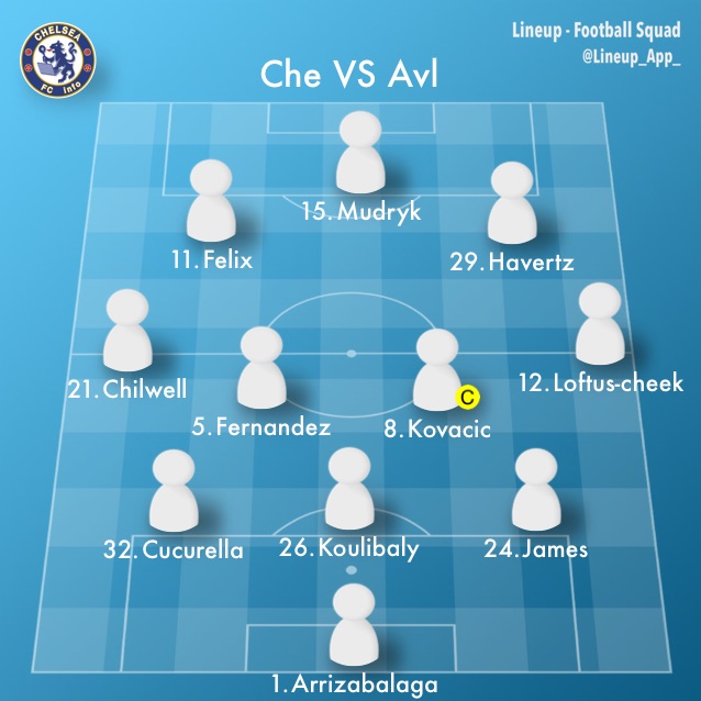 スターティングメンバーは、ケパ、ジェームズ、クリバリ、ククレジャ、ロフタスチーク、フェルナンデス、コバチッチ、チルウェル、フェリックス、ハヴァーツ、ムドリクでフォーメーションは、3-4-2-1。