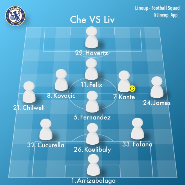 スターティングメンバーは、ケパ、W・フォファナ、クリバリ、ククレジャ、ジェームズ、フェルナンデス、カンテ、コバチッチ、チルウェル、フェリックス、ハヴァーツでフォーメーションは、3-6-1。
