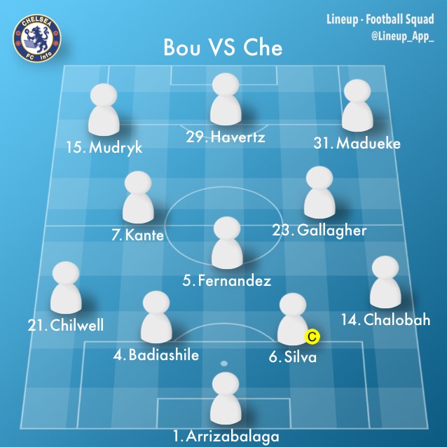 スターティングメンバーは、ケパ、チャロバー、シウバ、バディアシル、チルウェル、フェルナンデス、ギャラガー、カンテ、マドゥエケ、ムドリク、ハヴァーツでフォーメーションは4-3-3。