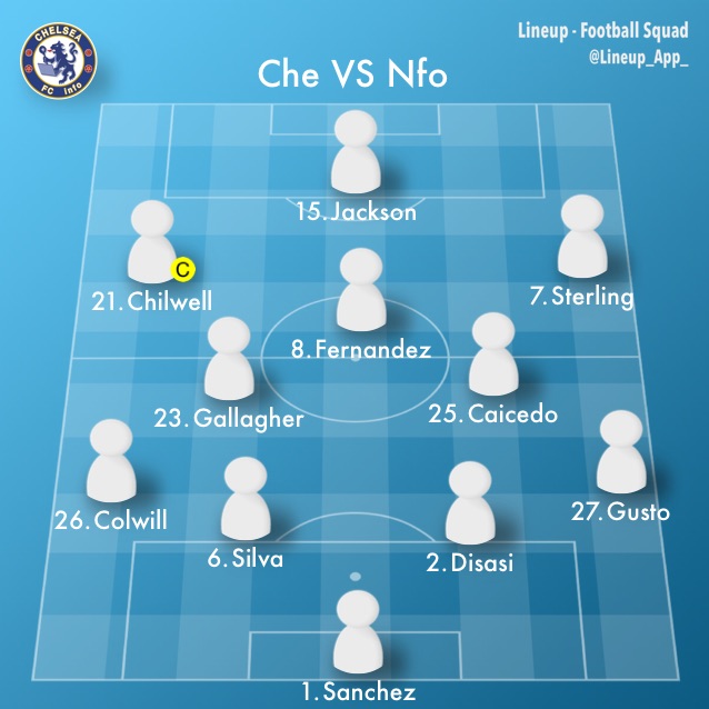 スターティングメンバーは、サンチェス、ディサシ、シウバ、コルウィル、ギュスト、フェルナンデス、ギャラガー、チルウェル、カイセド、スターリング、ジャクソンでフォーメーションは4-2-3-1。
