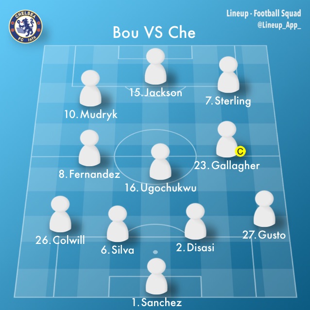 スターティングメンバーは、サンチェス、ディサシ、シウバ、コルウィル、ギュスト、フェルナンデス、ギャラガー、ウゴチュク、ムドリク、スターリング、ジャクソンでフォーメーションは4-3-3。