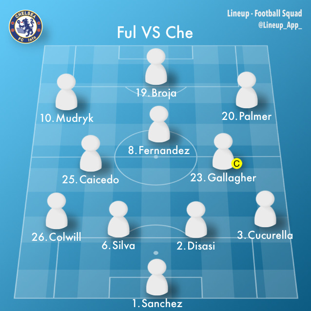 スターティングメンバーは、サンチェス、ククレジャ、ディサシ、シウバ、コルウィル、ギャラガー、カイセド、フェルナンデス、パルマー、ムドリク、ブロヤでフォーメーションは4-2-3-1。