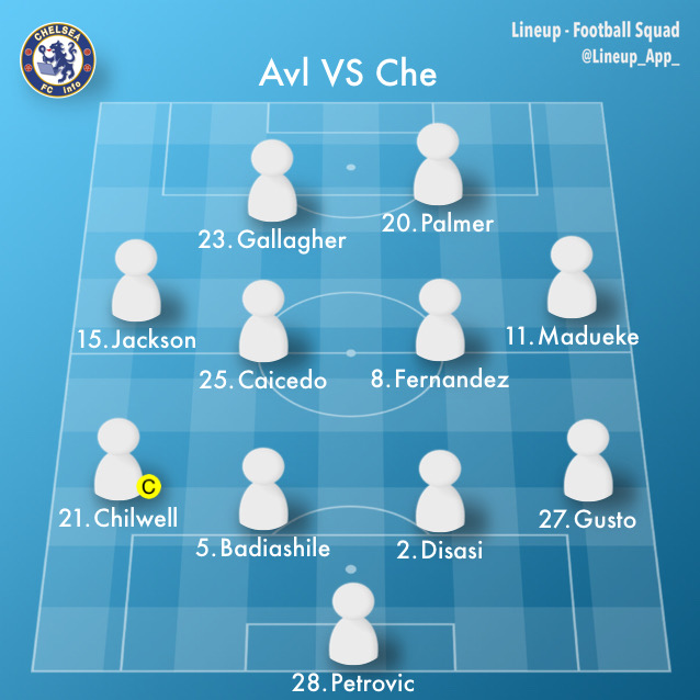 スターティングメンバーは、ペトロヴィッチ、ギュスト、ディサシ、バディアシル、チルウェル、カイセド、フェルナンデス、マドゥエケ、ジャクソン、ギャラガー、パルマーでフォーメーションは4-4-2。