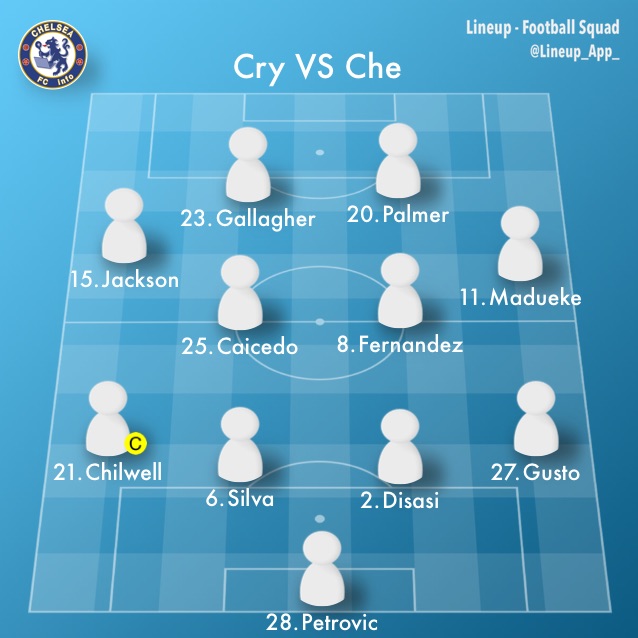 スターティングメンバーは、ペトロヴィッチ、ギュスト、ディサシ、シウバ、チルウェル、カイセド、ギャラガー、フェルナンデス、マドゥエケ、パルマー、ジャクソンでフォーメーションは4-4-2。