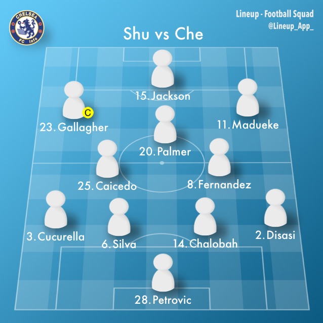 スターティングメンバー:ペトロヴィッチ、ディサシ、シウバ、チャロバー、ククレジャ、カイセド、フェルナンデス、ギャラガー、パルマー、マドゥエケ、ジャクソンでフォーメーションは4-2-3-1。